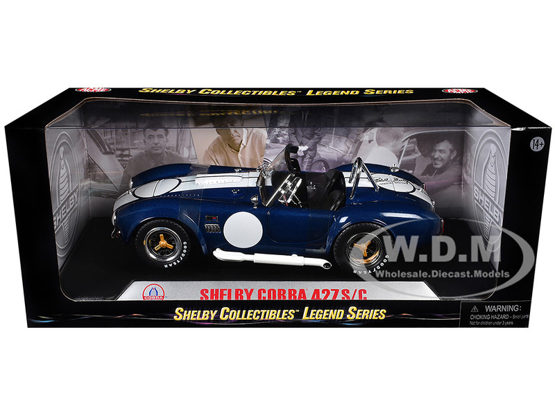 - Brand new 1/18 scale diecast car model of 1965 Shelby Cobra 427 S/C Dark Blue Metallic with White Stripes with Printed Carroll Shelby's Signature on the Trunk die cast model car by Shelby Collectibles.
