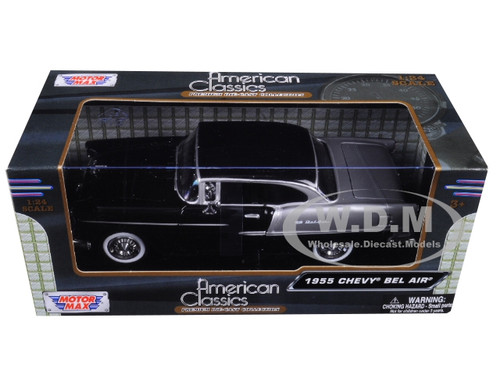 - Brand new 1:24 scale diecast car model of 1955 Chevrolet Bel Air Black and Silver die cast car by Motormax.