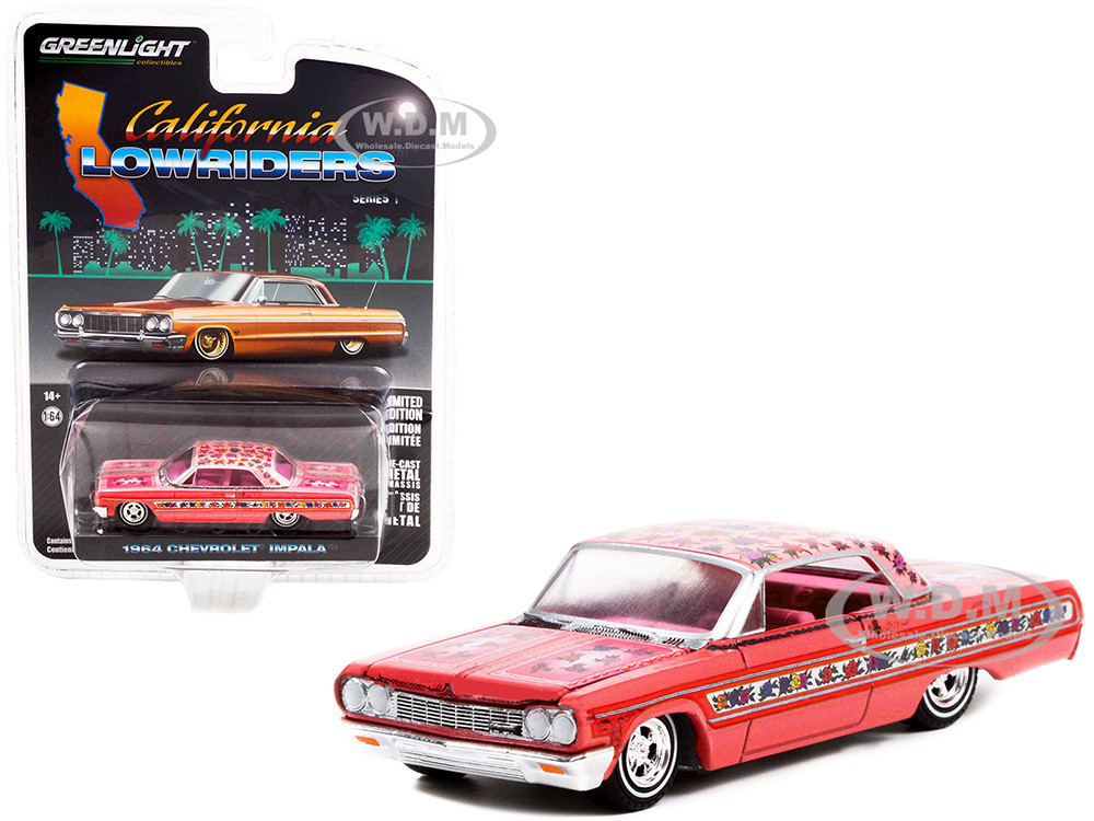 - Brand new 1/64 scale diecast car model of 1964 Chevrolet Impala Lowrider Pink Metallic with Rose Graphics and Pink Interior "California Lowriders" Release 1 die cast model car by Greenlight.