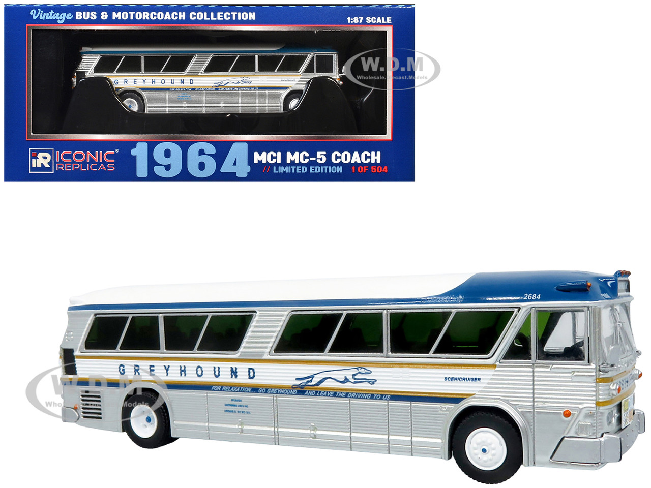 - Brand new 1/87 (HO) scale diecast model of 1964 MCI MC-5A Coach Bus "Greyhound Golden Anniversary" Silver with Blue and Gold Stripes "Vintage Bus & Motorcoach Collection" Limited Edition to 504 pieces Worldwide die cast model by