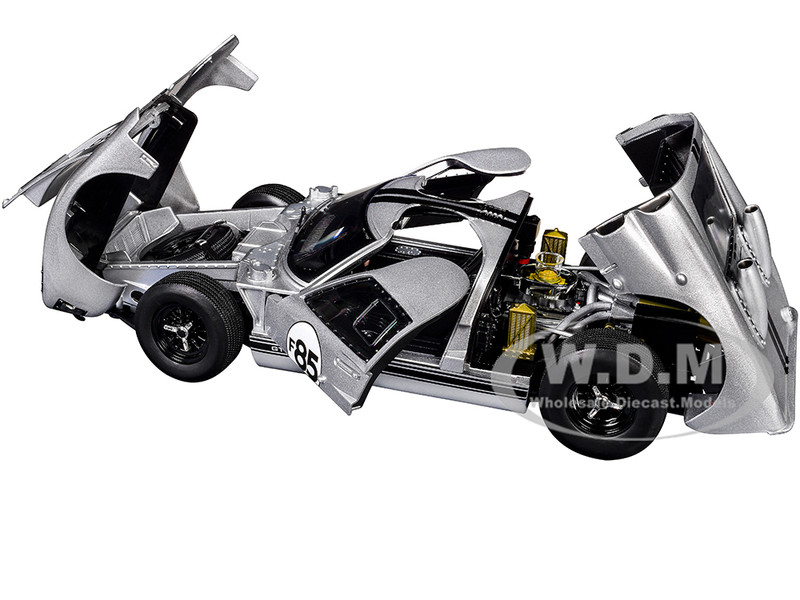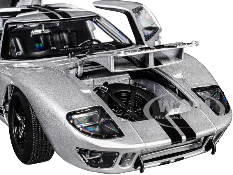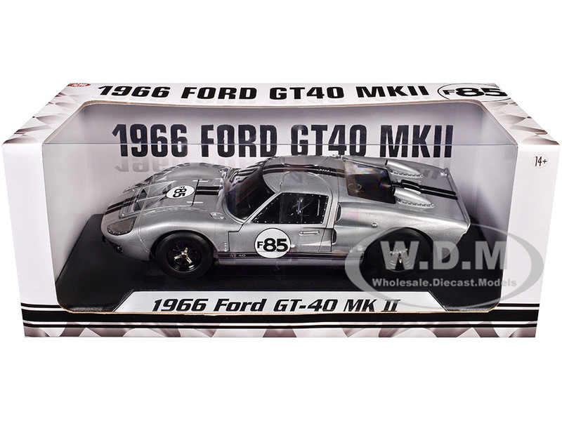 - Brand new 1/18 scale diecast car model of 1966 Ford GT-40 MKII #F85 Silver Metallic with Black Stripes die cast model car by ACME.
