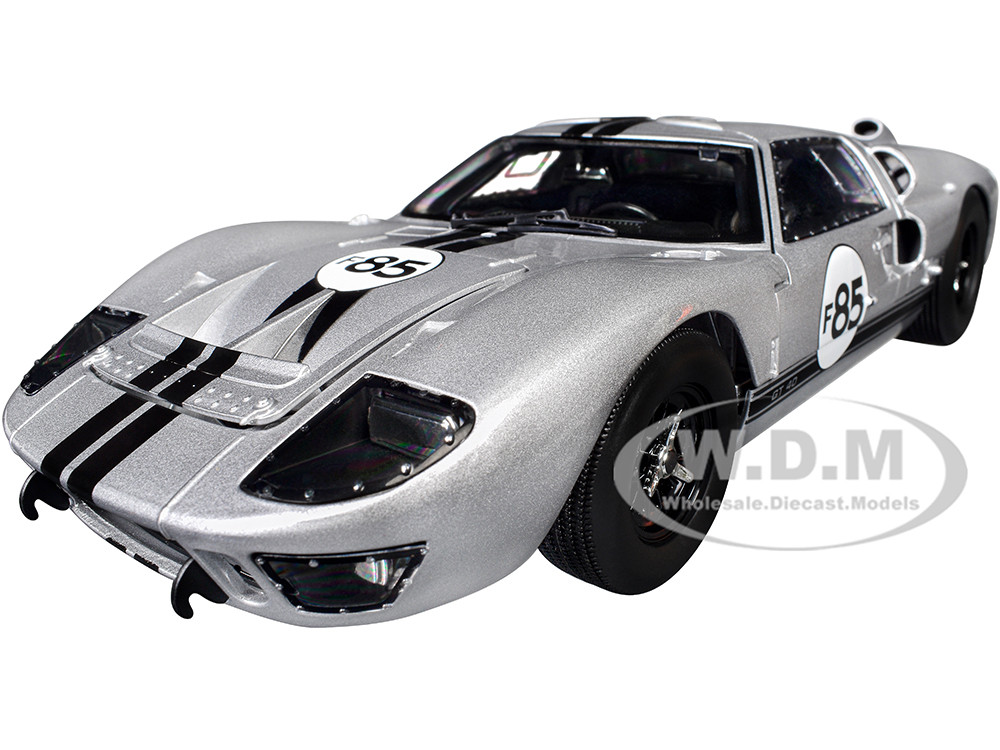 - Brand new 1/18 scale diecast car model of 1966 Ford GT-40 MKII #F85 Silver Metallic with Black Stripes die cast model car by ACME.