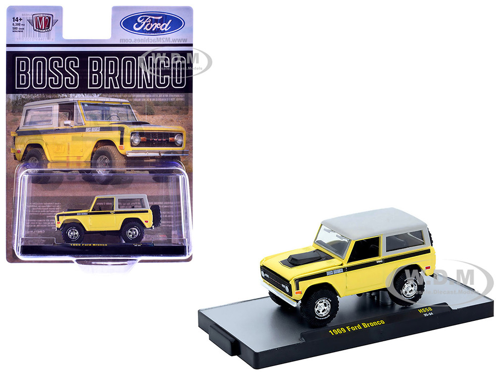 - Brand new 1/64 scale diecast car model of 1969 Ford Bronco Yellow with Black Stripes and Gray Top Limited Edition to 6380 pieces Worldwide die cast model car by M2 Machines.