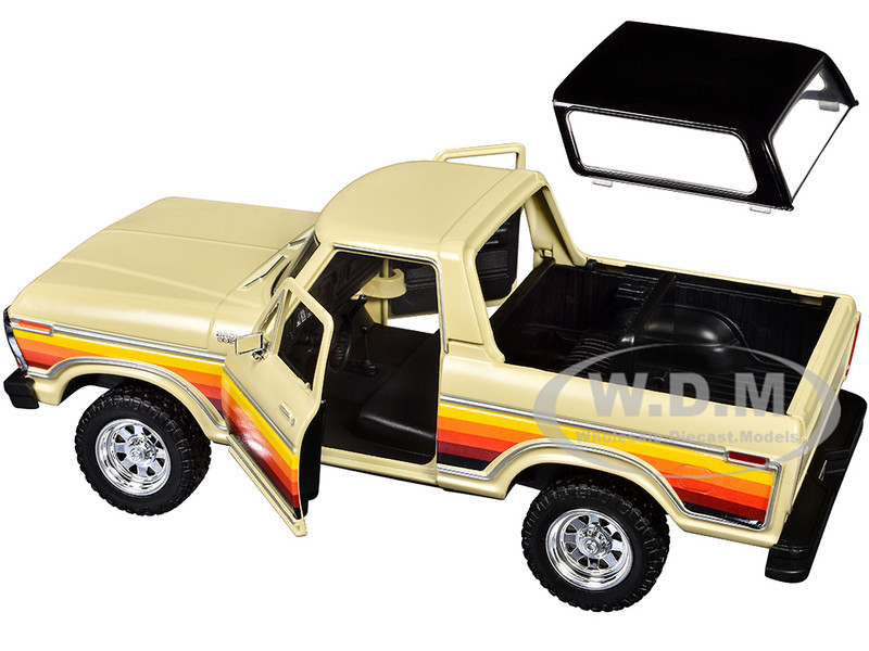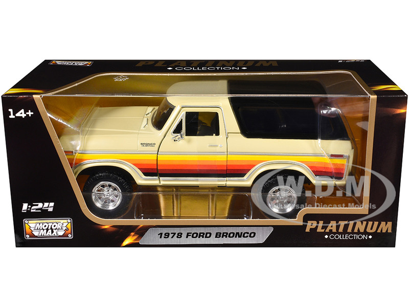 - Brand new 1/24 scale diecast car model of 1978 Ford Bronco Custom Cream with Stripes and Black Top "Platinum Collection" Series die cast model car by Motormax.