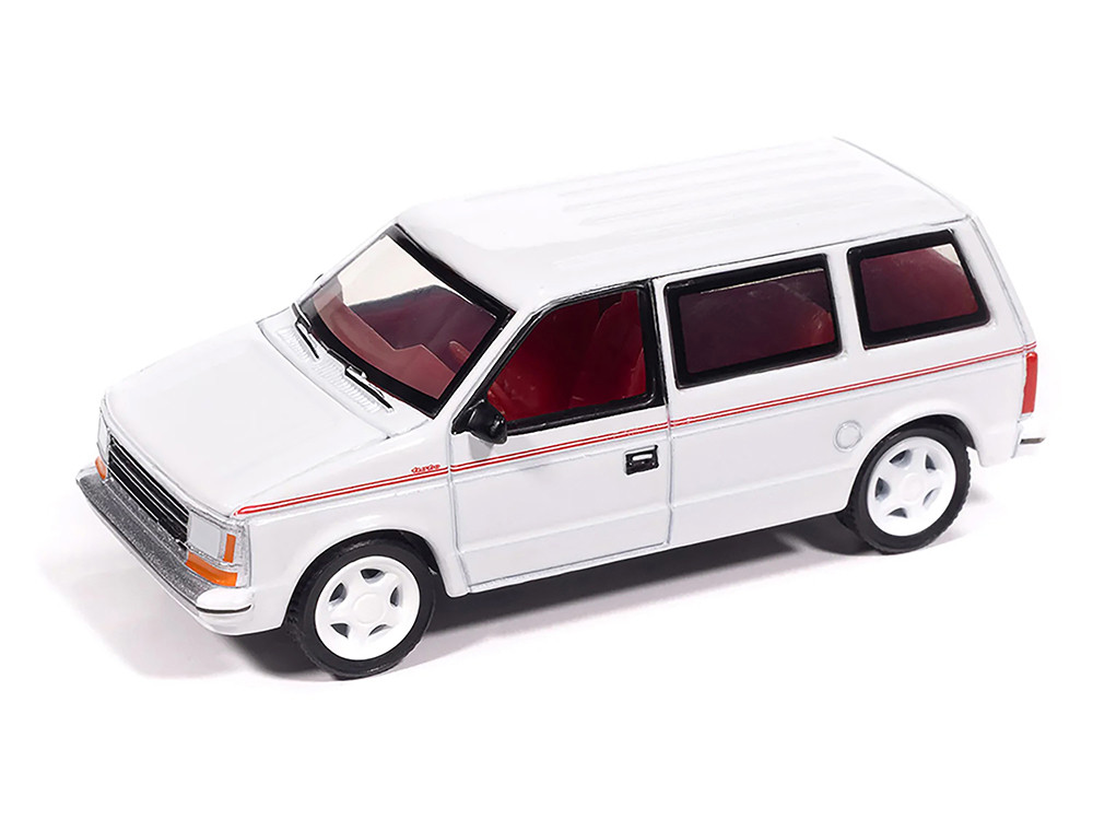 - Brand new 1/64 scale diecast car model of 1989 Plymouth Voyager Turbo Van Bright White with Red Stripes and Interior "Mighty Minivans" Series die cast model car by Auto World.