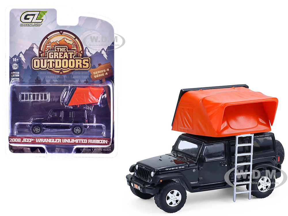 - Brand new 1/64 scale diecast model of 2008 Jeep Wrangler Unlimited Rubicon Dark Charcoal with Modern Rooftop Camper "The Great Outdoors" Series 4 die cast model car by Greenlight.