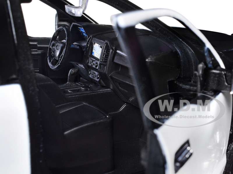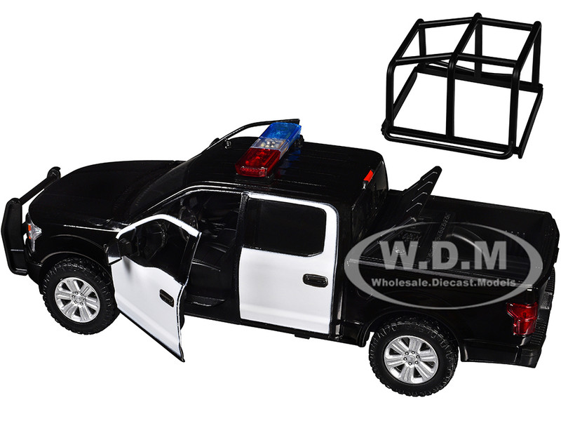 - 2019 Ford F-150 Lariat Crew Cab Pickup Truck with Bed Cage Black and White with Flashing Light Bar and Front and Rear Lights and Sounds 1/27 Diecast Model Car by Motormax