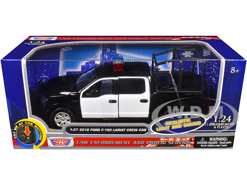- Brand new 1/27 scale diecast car model of 2019 Ford F-150 Lariat Crew Cab Pickup Truck with Bed Cage Black and White with Flashing Light Bar and Front and Rear Lights and Sounds die cast model car by Motormax.