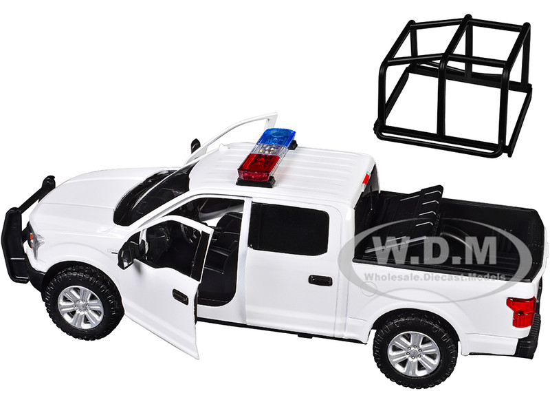 - 2019 Ford F-150 Lariat Crew Cab Pickup Truck with Bed Cage White with Flashing Light Bar and Front and Rear Lights and Sounds 1/27 Diecast Model Car by Motormax