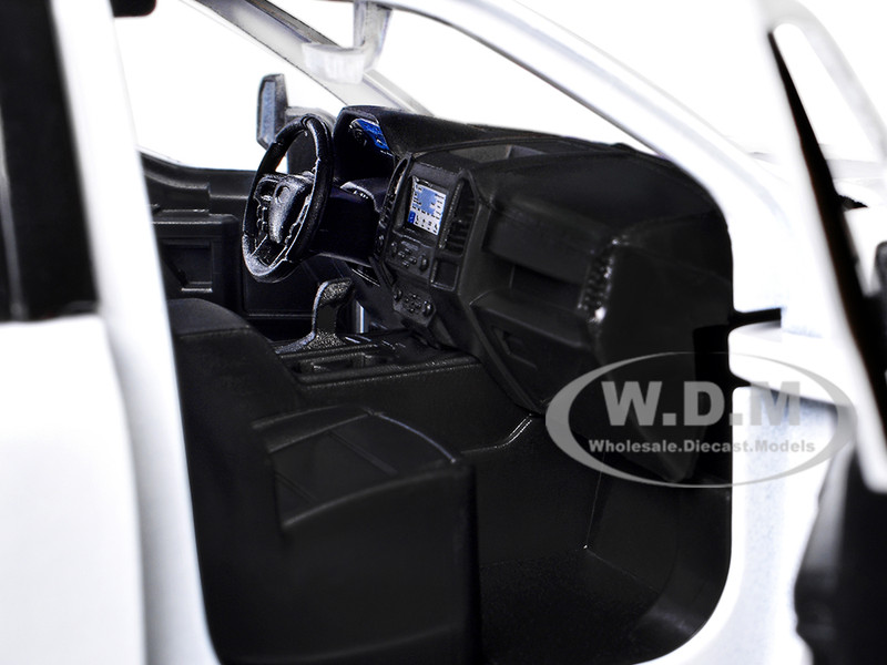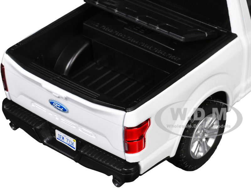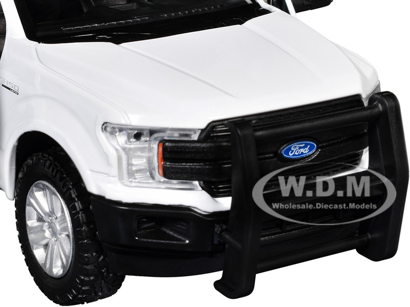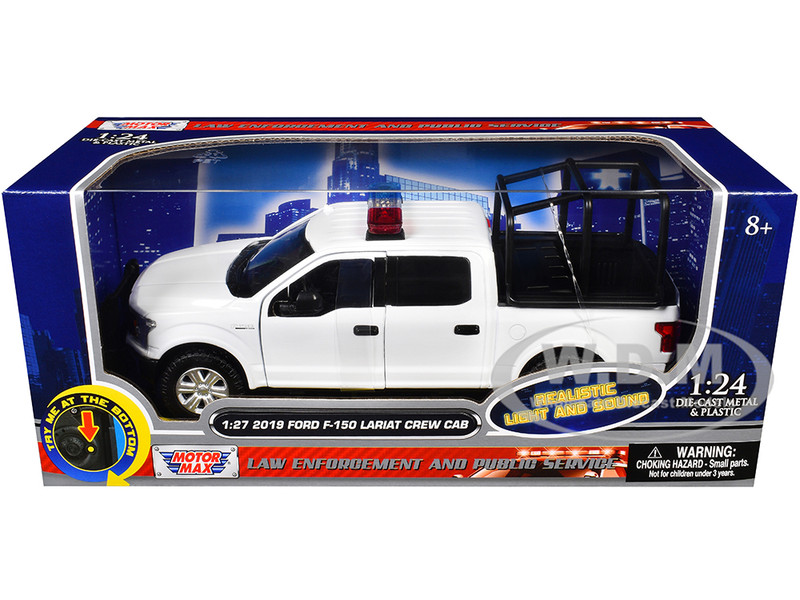 - Brand new 1/27 scale diecast car model of 2019 Ford F-150 Lariat Crew Cab Pickup Truck with Bed Cage White with Flashing Light Bar and Front and Rear Lights and Sounds die cast model car by Motormax.