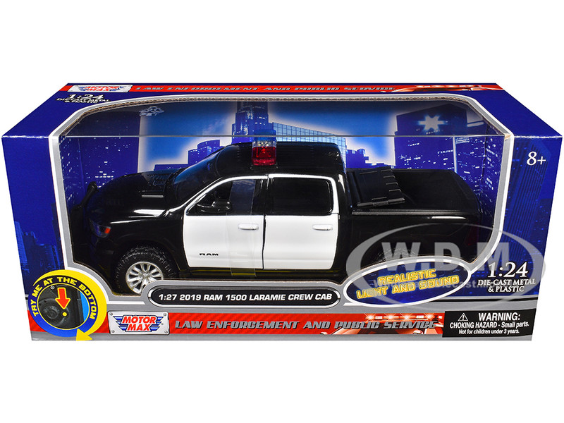 - Brand new 1/27 scale diecast car model of 2019 RAM 1500 Laramie Crew Cab Pickup Truck Black and White with Flashing Light Bar and Front and Rear Lights and Sounds die cast model car by Motormax.