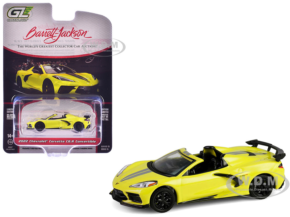 - Brand new 1/64 scale diecast car model of 2022 Chevrolet Corvette C8.R Convertible Yellow with Silver Stripes "Barrett-Jackson" Series 15 die cast model car by Greenlight.