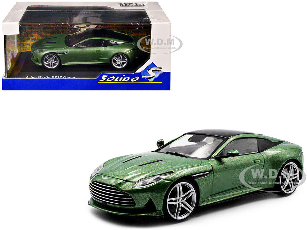 - Brand new 1/43 scale diecast car model of 2023 Aston Martin DB12 Coupe Iridescent Emerald Metallic with Black Top die cast model car by Solido.