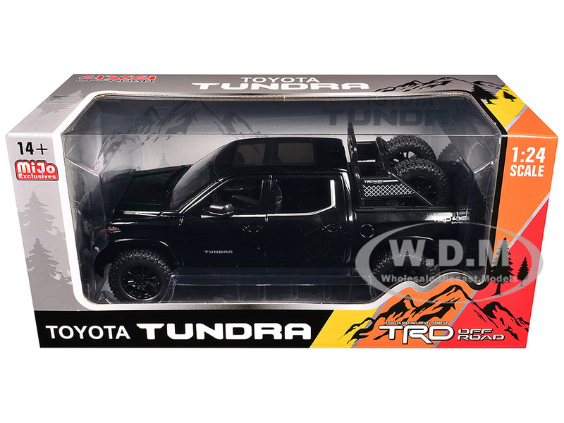 - Brand new 1/24 scale diecast car model of 2023 Toyota Tundra TRD 4x4 Pickup Truck Black with Sunroof and Wheel Rack die cast model car.