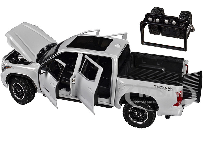- Brand new 1/24 scale diecast car model of 2023 Toyota Tundra TRD 4x4 Pickup Truck Cement Gray with Sunroof and Wheel Rack die cast model car.