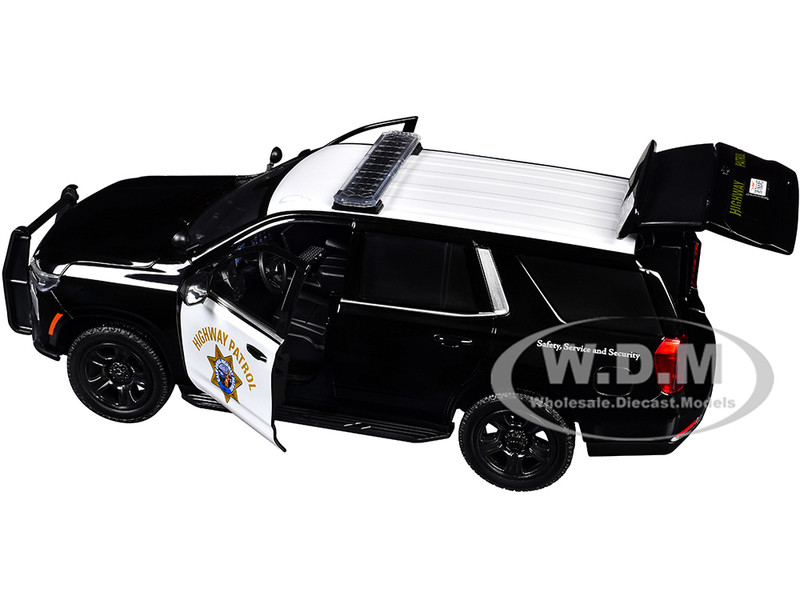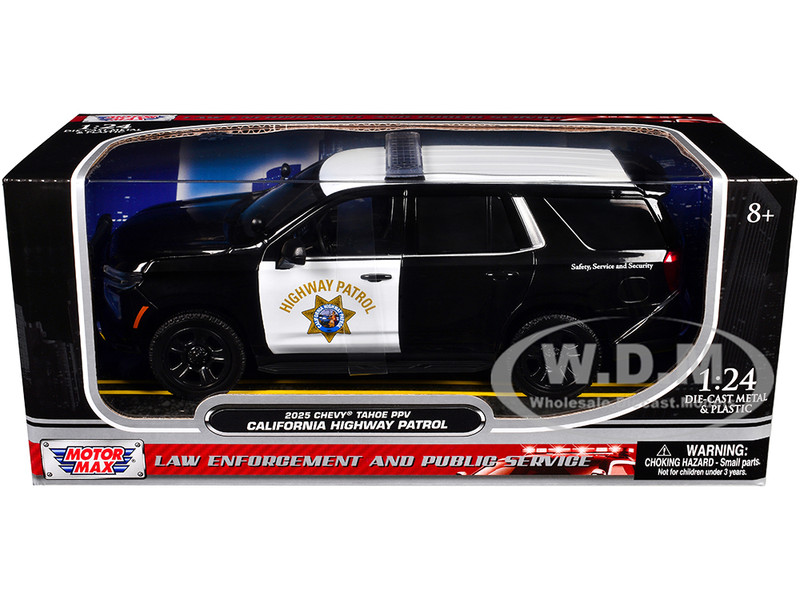 - Brand new 1/24 scale diecast car model of 2025 Chevrolet Tahoe Police Pursuit Vehicle "California Highway Patrol" Black and White "Law Enforcement and Public Service" Series die cast model car by Motormax.