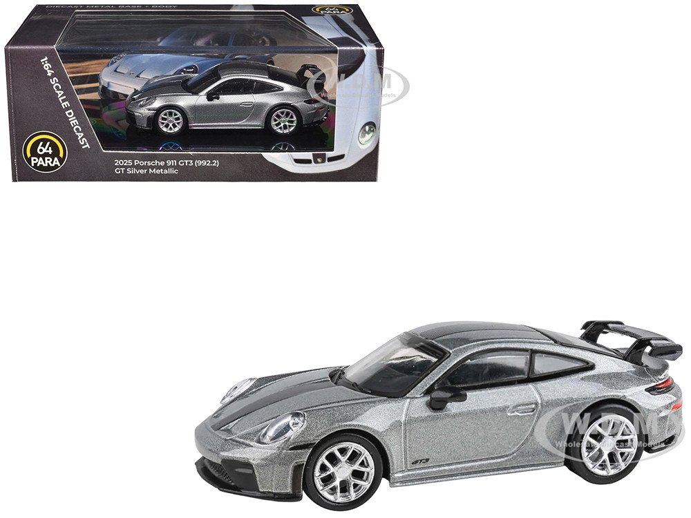 - Brand new 1/64 scale diecast car model of 2025 Porsche 911 GT3 (992.2) GT Silver Metallic with Carbon Stripe die cast model car by Paragon.
