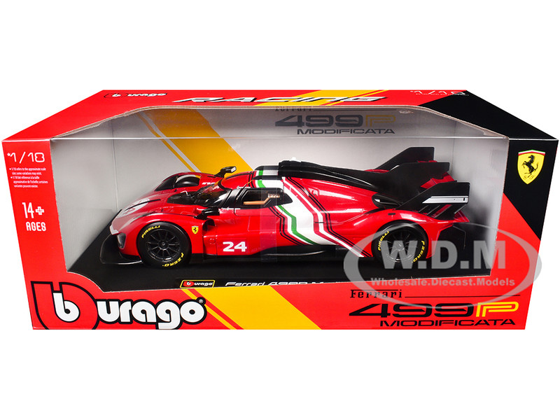 - Brand new 1/18 scale diecast car model of Ferrari 499P Modificata #24 Red with Italian Flag Stripes "Racing" Series die cast model car by Bburago.