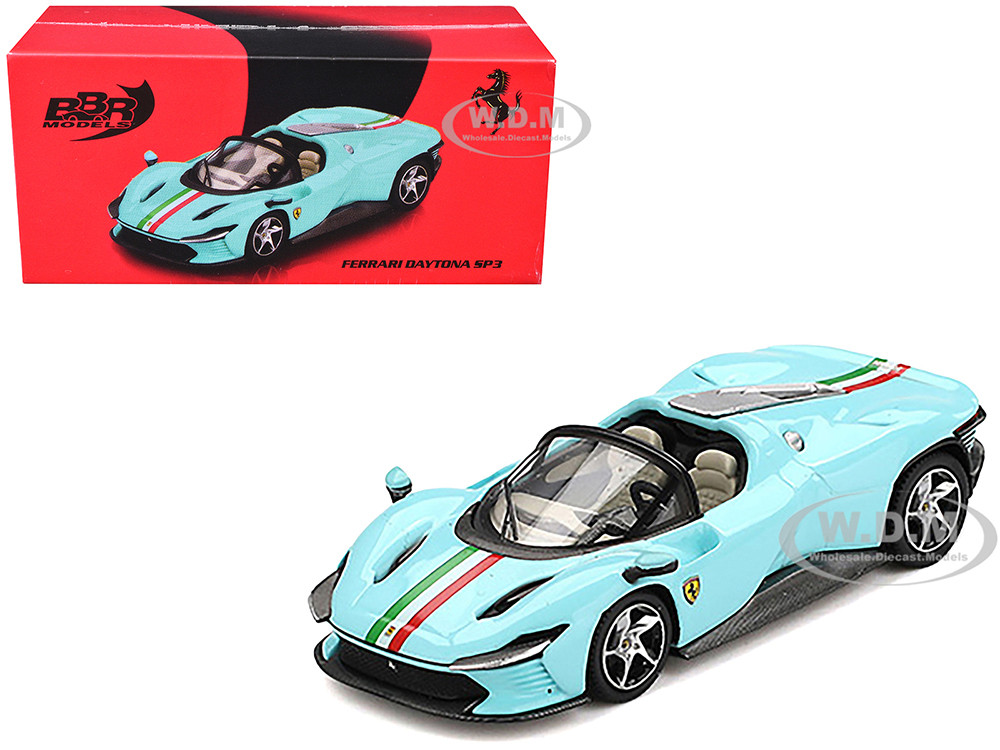 - Brand new 1/64 scale diecast car model of Ferrari Daytona SP3 Light Blue with Italian Flag Stripes die cast model car by BBR Models.