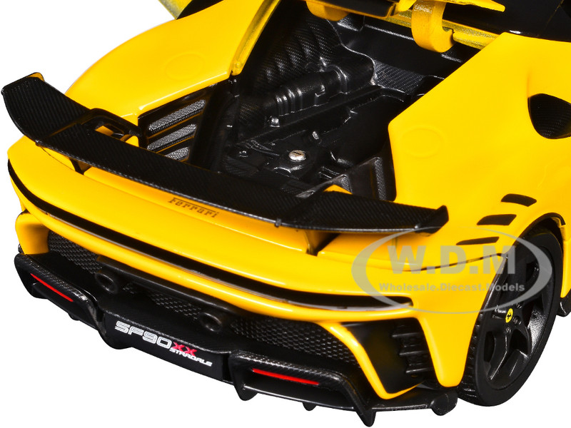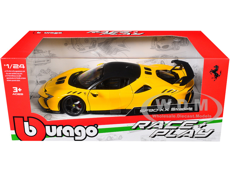 - Brand new 1/24 scale diecast car model of Ferrari SF90 XX Stradale Yellow with Black Top "Race and Play" Series die cast model car by Bburago.