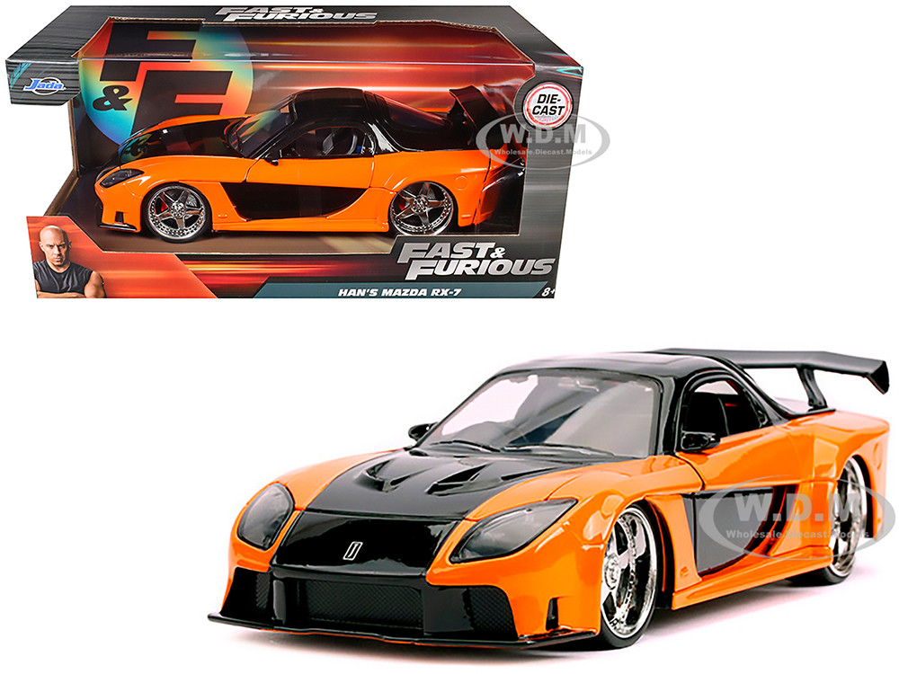 - Brand new 1/24 scale diecast car model of Han's Mazda RX-7 RHD (Right Hand Drive) Orange and Black "Fast & Furious" Movie die cast model car by Jada.