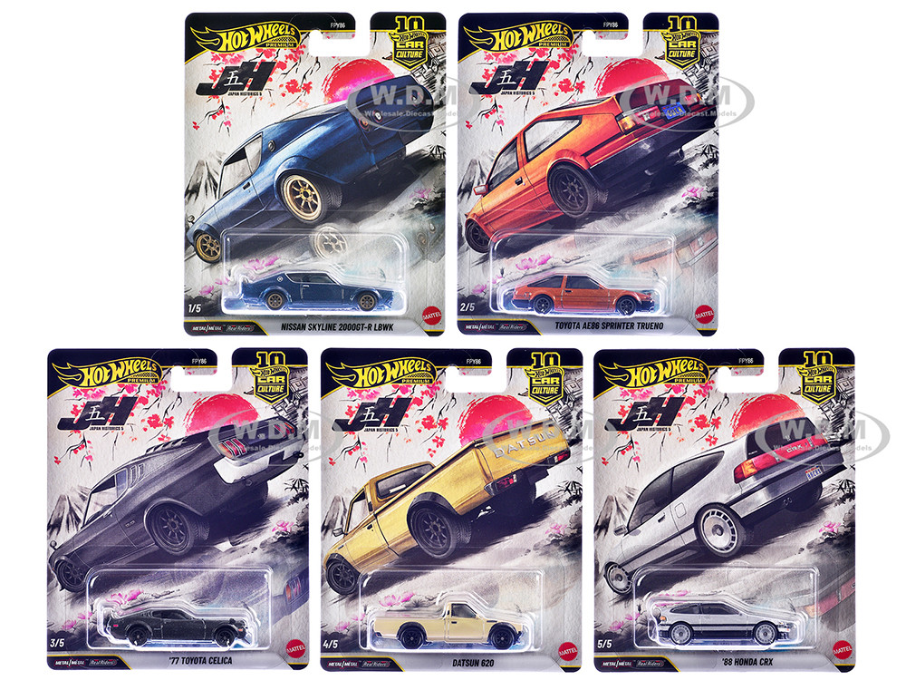 - Brand new diecast car models of "Japan Historics 5" 5 piece Set "Car Culture 10th Anniversary" 2025 Series P die cast model cars by Hot Wheels.