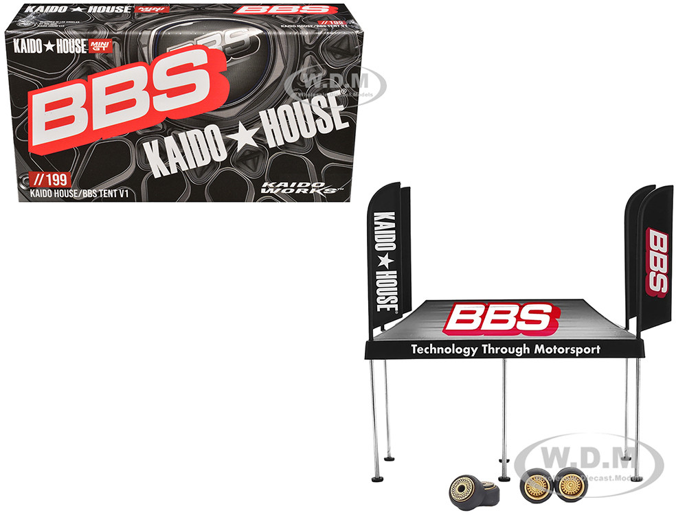 - Brand new 1/64 scale diecast models of Kaido House "BBS" Tent V1 Black with Extra Wheels for 1/64 scale models by Mini GT.