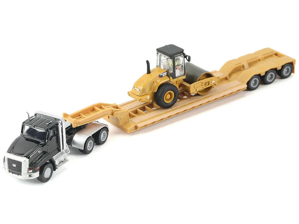 - Kenworth T880 Tractor Black with Lowboy Trailer and CAT Roller Yellow 1/87 (HO) Diecast Model by Diecast Masters
