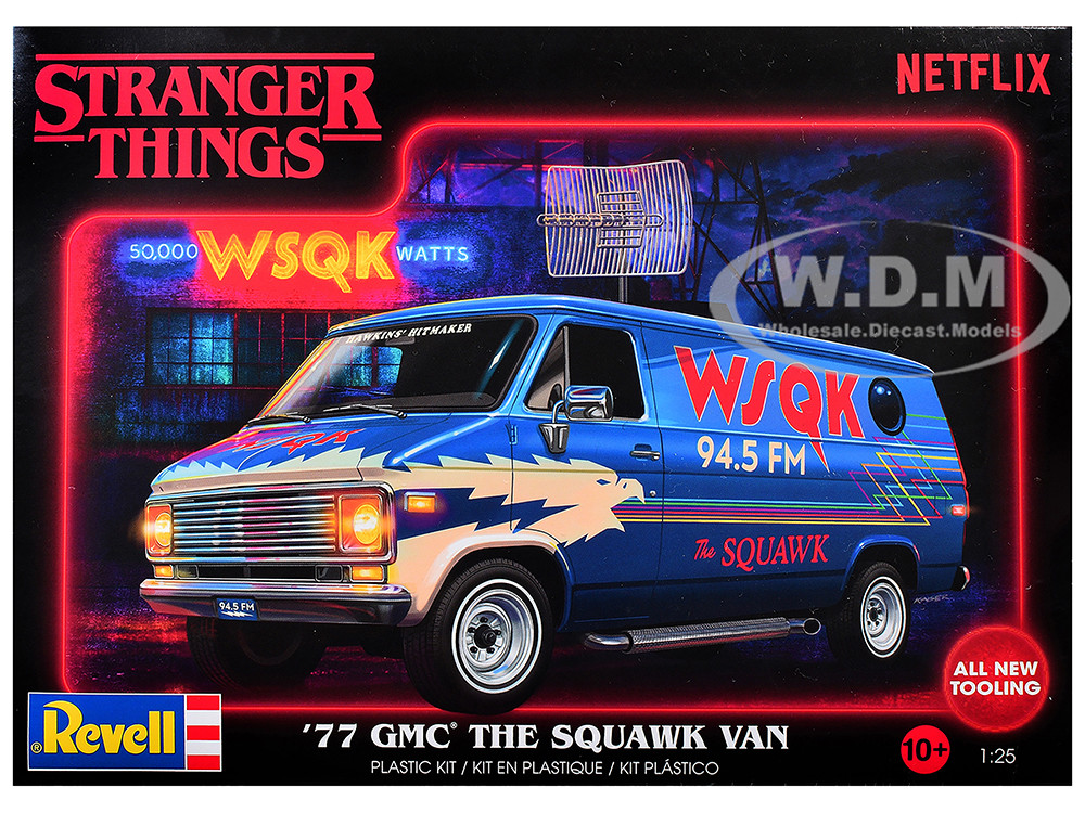 - Brand new plastic model kit of 1977 GMC "WSQK Squawk" Van "Stranger Things" (2016-2025) TV Series (Level 3) 1/25 plastic model kit by Revell.