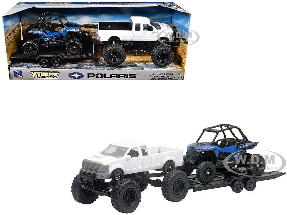- Lifted Pickup Truck White and Polaris RZR XP Turbo Blue with Flatbed Trailer "Xtreme Off-Road" Series Diecast Model by New Ray