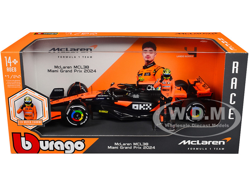 - Brand new 1/24 scale diecast car model of McLaren MCL38 #4 Lando Norris "OKX" Winner Formula One F1 "Miami GP" (2024) with Driver Figure "Race" Series die cast model car by Bburago.