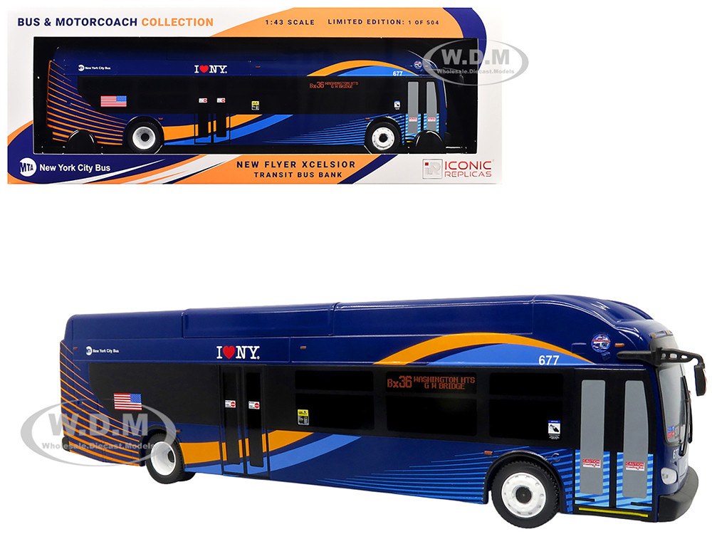 - Brand new 1/43 scale model of New Flyer Xcelsior Transit Bus "MTA New York City" Blue with Graphics "The Bus & Motorcoach Collection" Limited Edition to 504 Pieces Worldwide model by Iconic Replicas.
