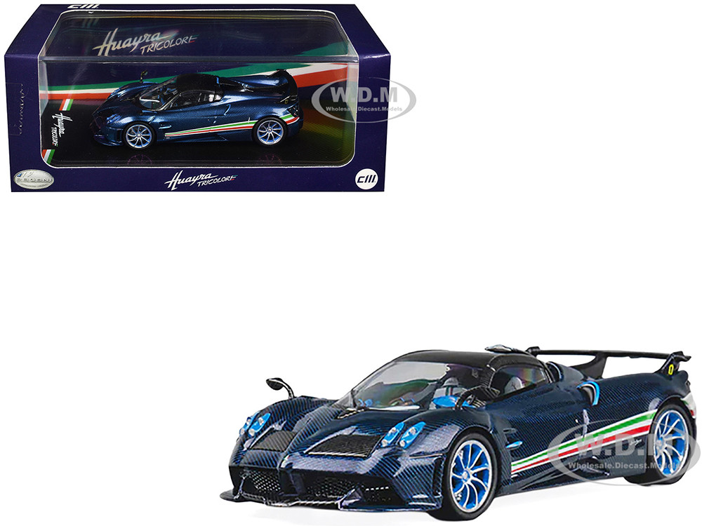 - Brand new 1/64 scale diecast car model of Pagani Huayra Tricolore Blue Carbon Metallic with Black Carbon Top and Italian Flag Stripes die cast model car by CM Model.