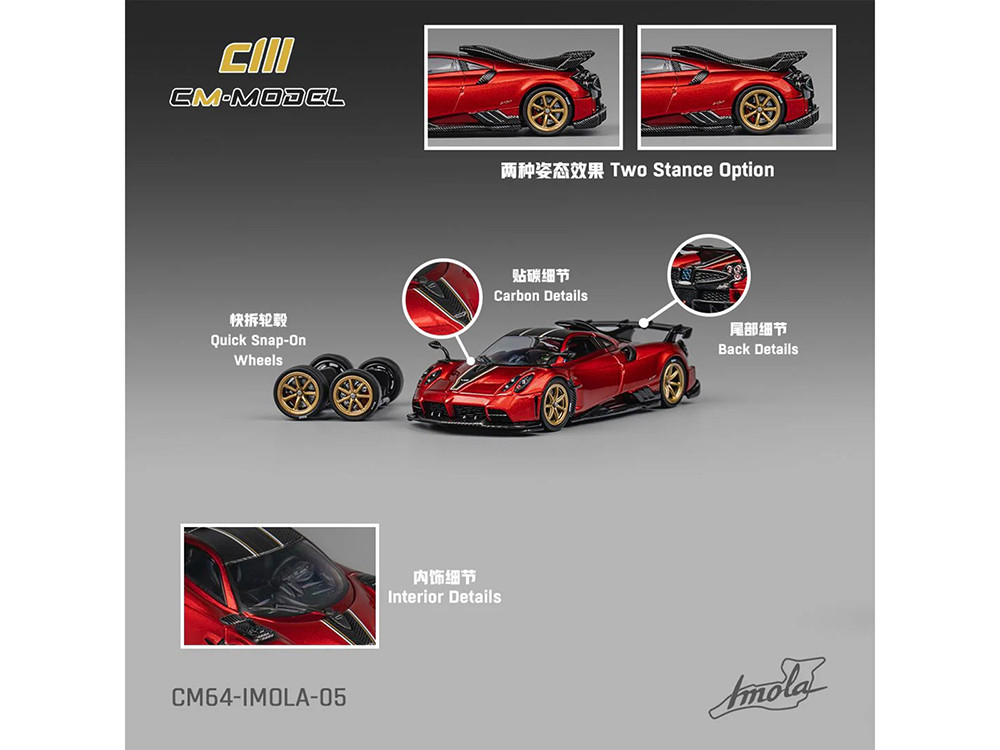 - Brand new 1/64 scale diecast car model of Pagani Imola Red Metallic with Carbon Top and Stripes with Extra Wheels die cast model car by CM Model.