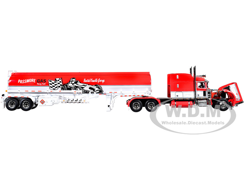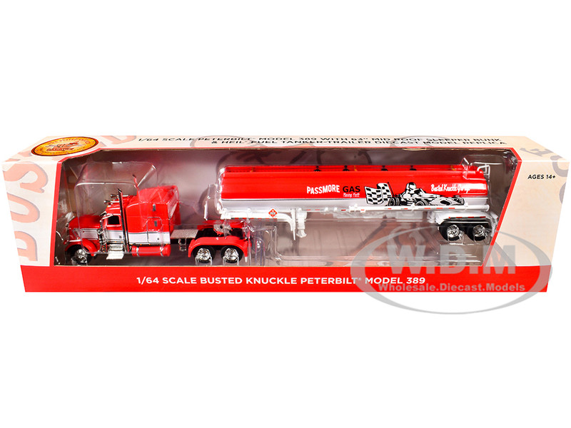 - Brand new 1/64 scale diecast model of Peterbilt 389 with 63" Mid-Roof Sleeper and Heil Fuel Tank Trailer "Busted Knuckle Garage" Red and White die cast model by DCP/First Gear.