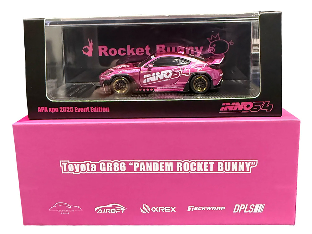 - Brand new 1/64 scale diecast car model of Toyota GR86 "Pandem Rocket Bunny" RHD (Right Hand Drive) Pink Metallic with Graphics "APA XPO 2025 Event Exclusive" die cast model car by Inno Models.