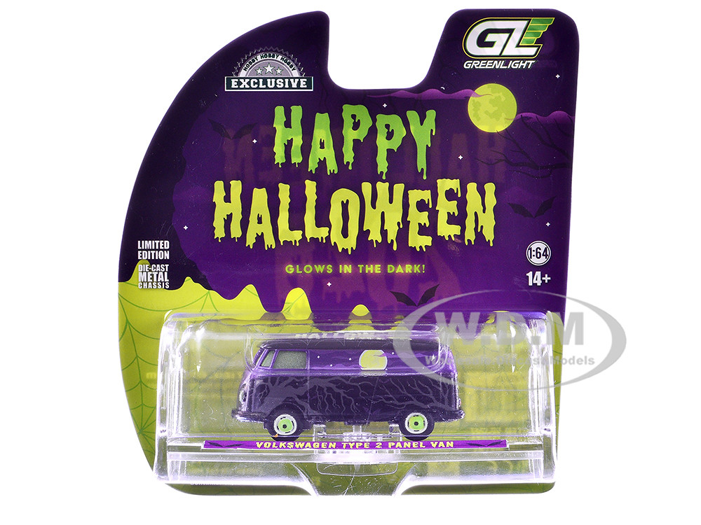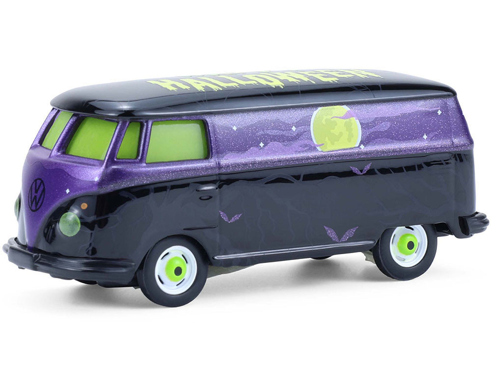 - Brand new 1/64 scale diecast car model of Volkswagen Type 2 Panel Van "Halloween 2025 - Spooky Night" Black and Purple with "Glow in the Dark" Paint "Hobby Exclusive" Series die cast model car by Greenlight.